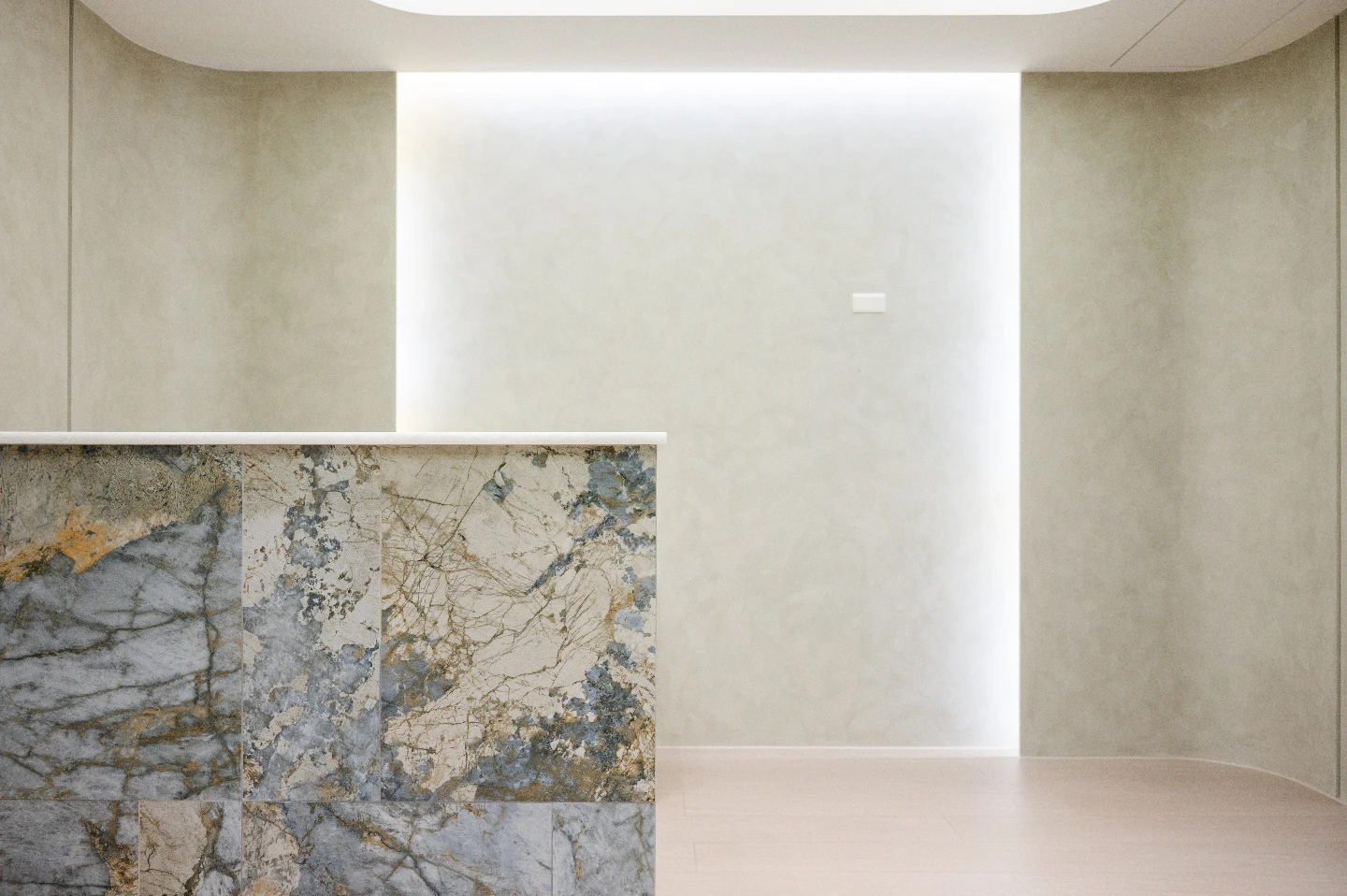 以天然蛇紋綠石材(Serpentine Green) 裁切成不規則尺寸方塊, 透過仿水磨石的排列語彙重新組構, 把石材的原始質感,拼成耐看的日常風景。